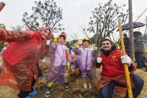 植树现场,来自学校附属幼儿园的孩子们、中外学生代表与老师们一起并肩协作,扶苗、培土、浇水、悬挂心愿卡,共同用双手为校园播撒绿色,用行动践行生态责任。